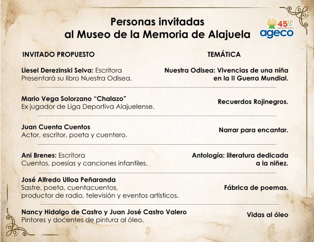 22 de setiembre de 2025, San José, Costa Rica. La Asociación Gerontológica Costarricense (AGECO) realizará por primera vez un Museo de la Memoria en la provincia de Alajuela. Este esfuerzo forma parte de las actividades en conmemoración del 45 aniversario de AGECO del mes de octubre y busca destacar el talento de personas mayores locales y su aporte a la sociedad en diversos ámbitos.